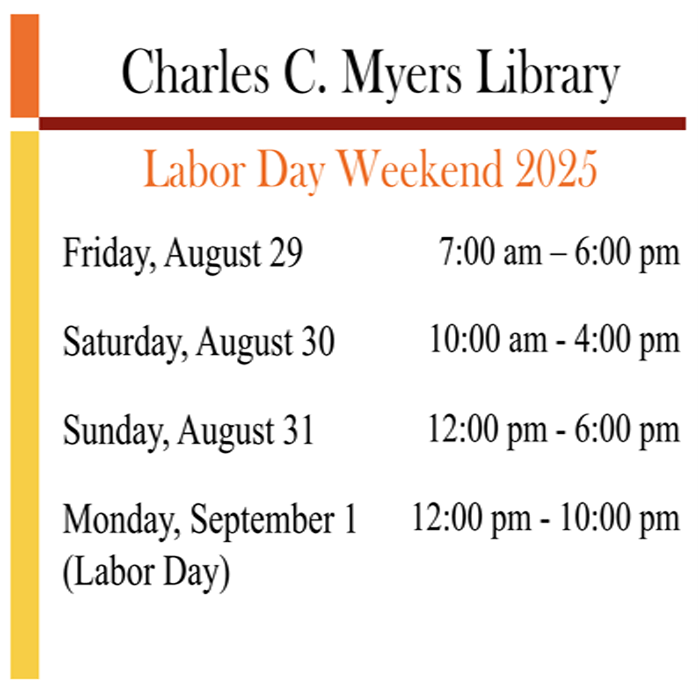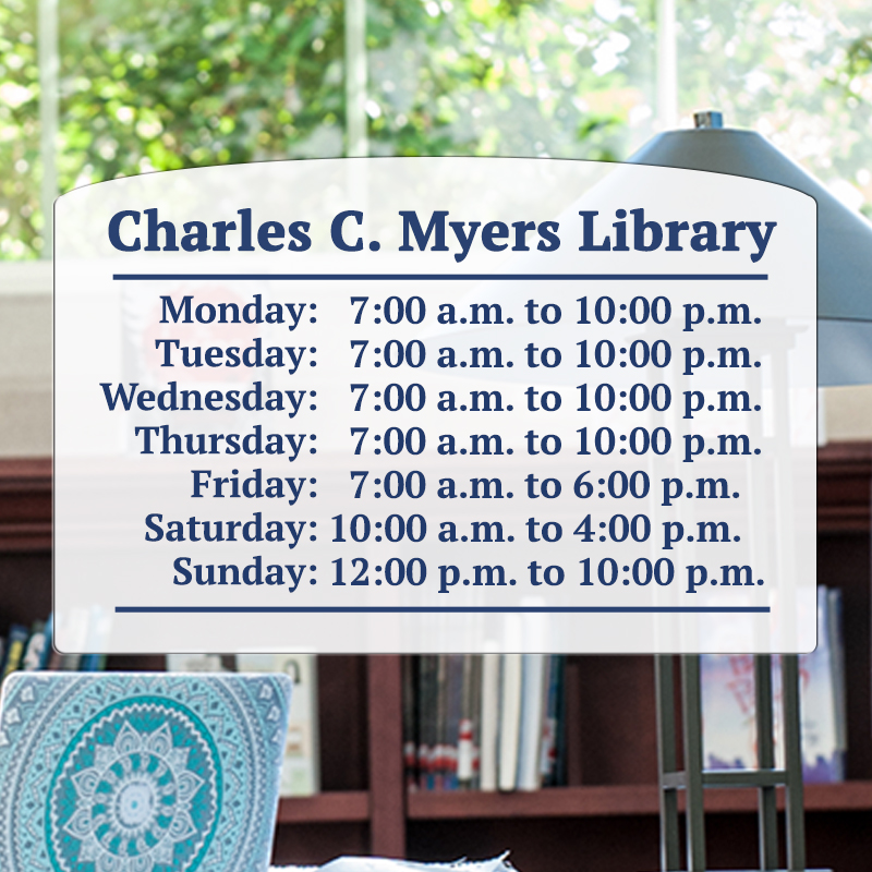 The Charles C. Myers Library staff connects students to resources they need to become educated, life-long learners. The Library is also a cultural center with a welcoming learning environment.